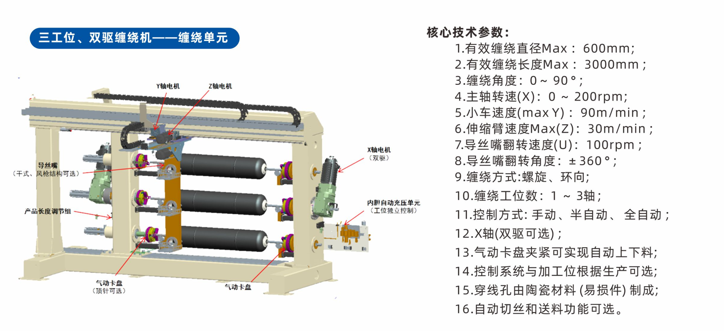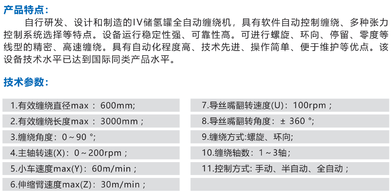 遠望智造,用實力創造價值! 我們在自動化設備制造領域,無所不能,無所不精! 自行研發,設計和制造的IV儲氫罐全自動纏繞機,具有軟件自動控制纏繞,多種張力控制系統選擇等特點。設備運行穩定性強,可靠性高。可進行螺旋、環向、停留、零度等線型的精密、高速纏繞。